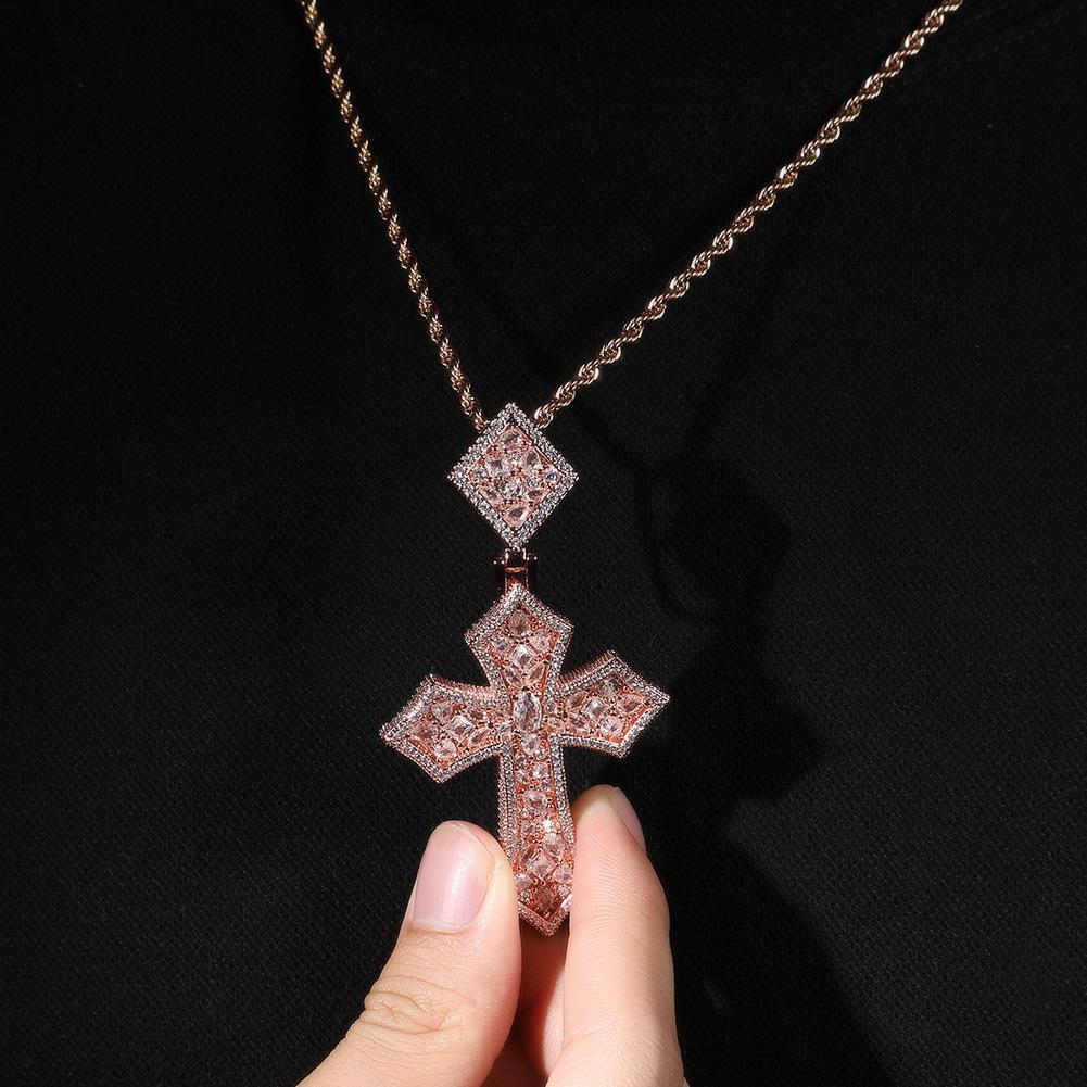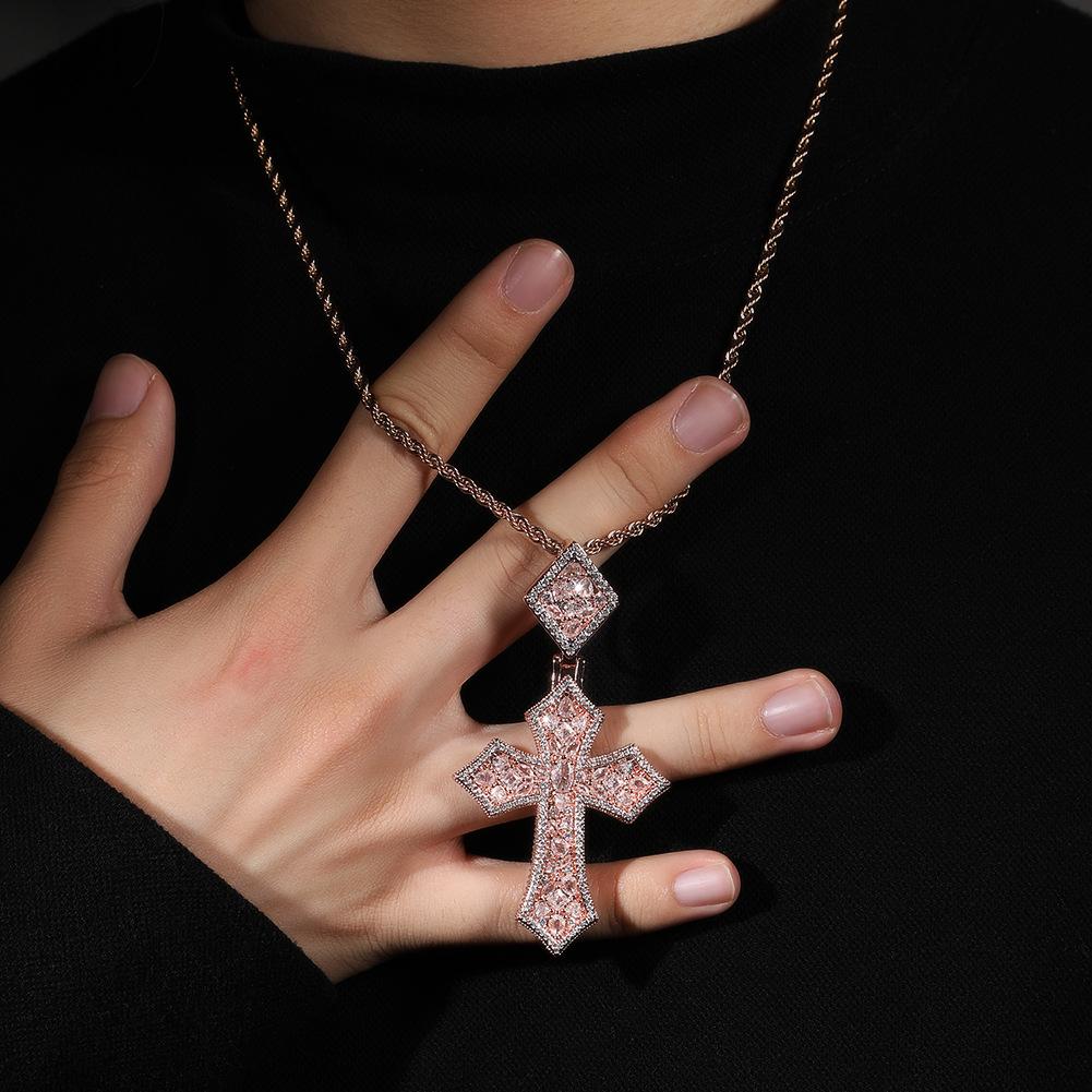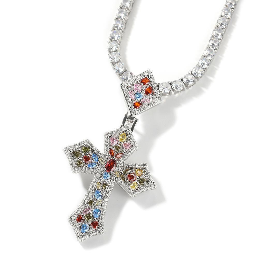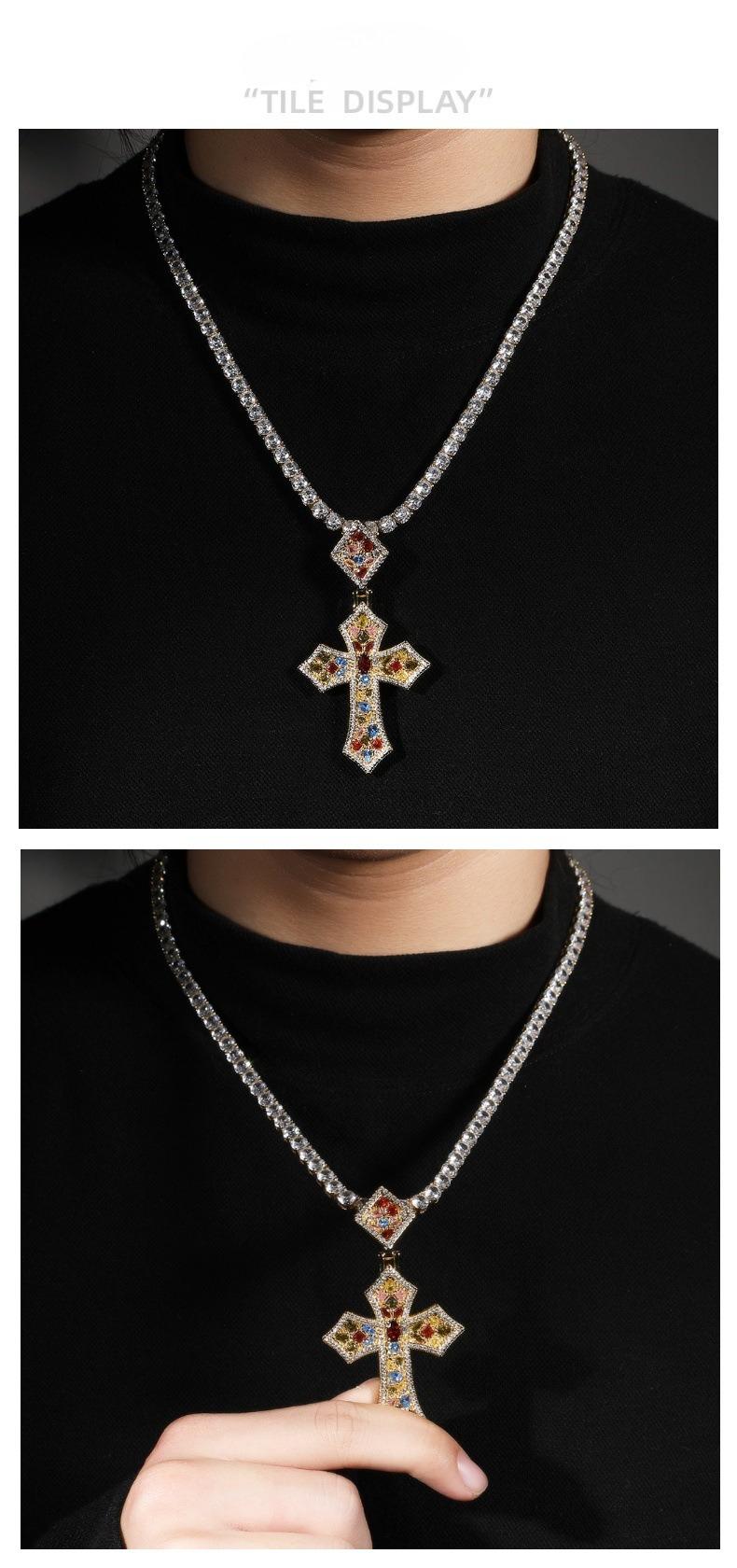 [ICE HUE] Oval-Cut Norwegian Cubic Zirconia Bling Rhomboid Gothic Cross Pendant Necklace, Jewelry Chain for Men Women